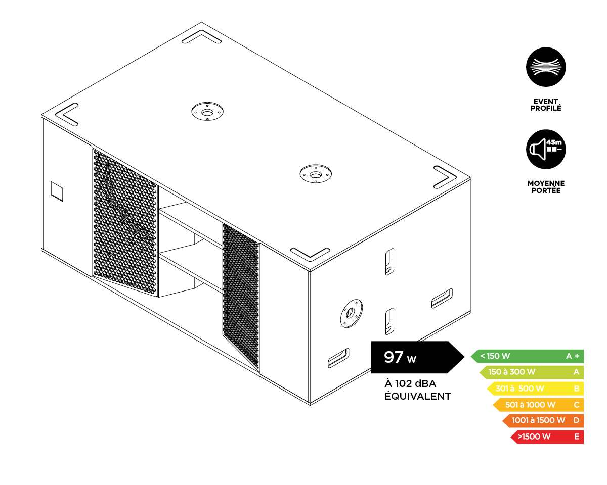 The VTL218 is PikiP’s new dual 18-inch subwoofer. Its hybrid resonator loading system delivers unmatched efficiency across an extended frequency range, from 37 to 250 Hz [97 W at 102 dBA equivalent]. The resonators have been optimized using finite element modeling to reduce air velocity and maintain linearity even at high output levels. The 35 mm pole mounts make it perfectly compatible with the VCH30 module, whether in vertical or horizontal configuration. Its pseudo-omnidirectional dispersion facilitates cardioid setups. Speakon connectors allow power supply via a 4-core cable or two 2-core cables.