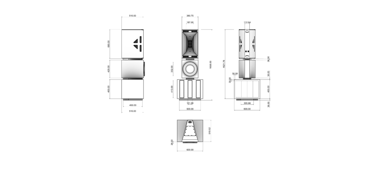 For low frequencies, a custom-made enclosure was designed to complement the system and evoke the look of a “Roman column.” This bass cabinet, fitted with a 12’’ bass-reflex driver, delivers deep and precise lows without resonance. The full system operates efficiently from 45 Hz to 18 kHz.