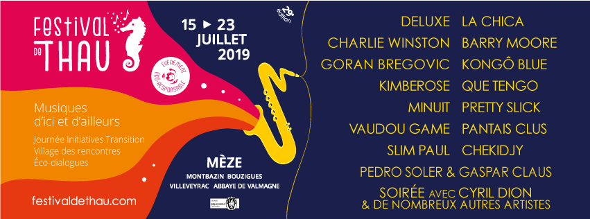 Cette année encore, nous serons présents au Festival de THAU, dans le cadre charmant du port de Mèze, au bord de l'étang de Thau du 18 au 21 juillet. L'événement associe une programmation musicale, diversifiée et de qualité, à des actions de sensibilisation au développement durable : des éco-dialogues, un village des rencontres, une journée initiatives et transition et une journée de rencontres suivie d'une soirée musicale, festive et engagée face à l'urgence climatique autour de Cyril Dion (réalisateur du film « Demain ») et de nombreux artiste comme La CHICA, Emily LOIZEAU, Hugh COLTMAN, Piers FACCINI, KALUNE, FELOCHE, NACH...